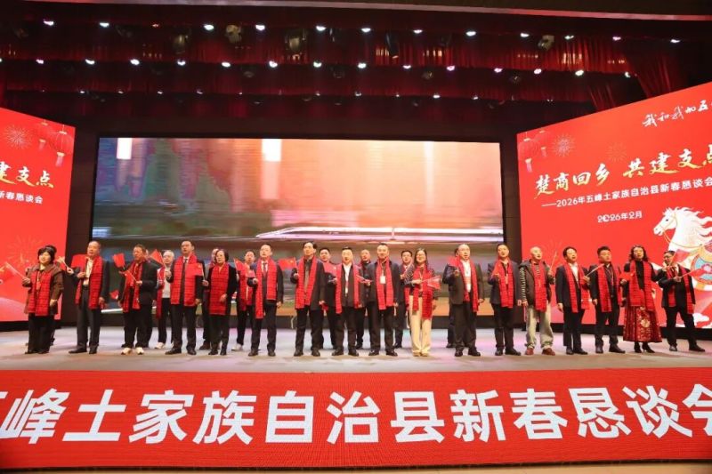 2月14日,我县举行“楚商回乡·共建支点”2026年新春恳谈会。来自全国各地的五峰籍企业家及优秀人士代表齐聚一堂,共叙乡情、共谋发展。县委书记谭志军出席并讲话,县委副书记、县长覃业成主持。